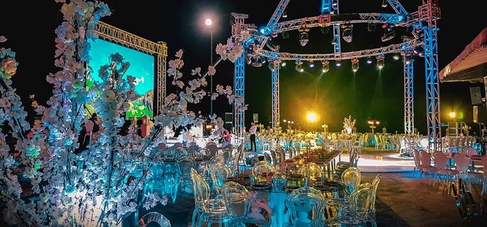 Holiday Beach Hotel The largest and most luxurious halls ever, with their large spaces, luxurious decorations, coordinated lighting, and crystal tables, in addition to the distinguished service.